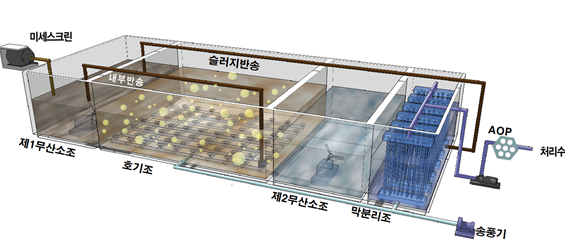 국산 중공사 분리막과 2단 무산소조를 이용한 추가 탈질 공법으로, 수용용수 및 재이용 가능 수준의 처리 수질 확보가 가능한 기술 우수성과 경제성을 겸비한 하폐수 초고도처리 시스템
