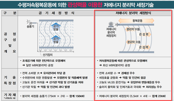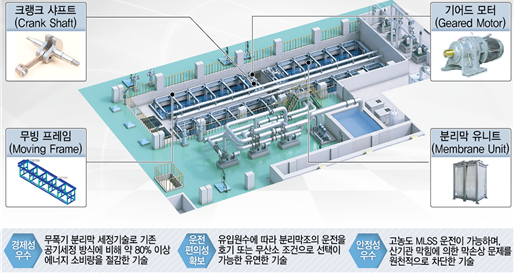 중공사막 생물반응조 (MBR) 공정에서 분리막 프레임을 수평 왕복으로 흔들어 막을 세정하는 무폭기 세정기술로, 막 세정에 소요되는 에너지를 절감하고 안정적인 공정 운영이 가능한 하·폐수 고도처리기술